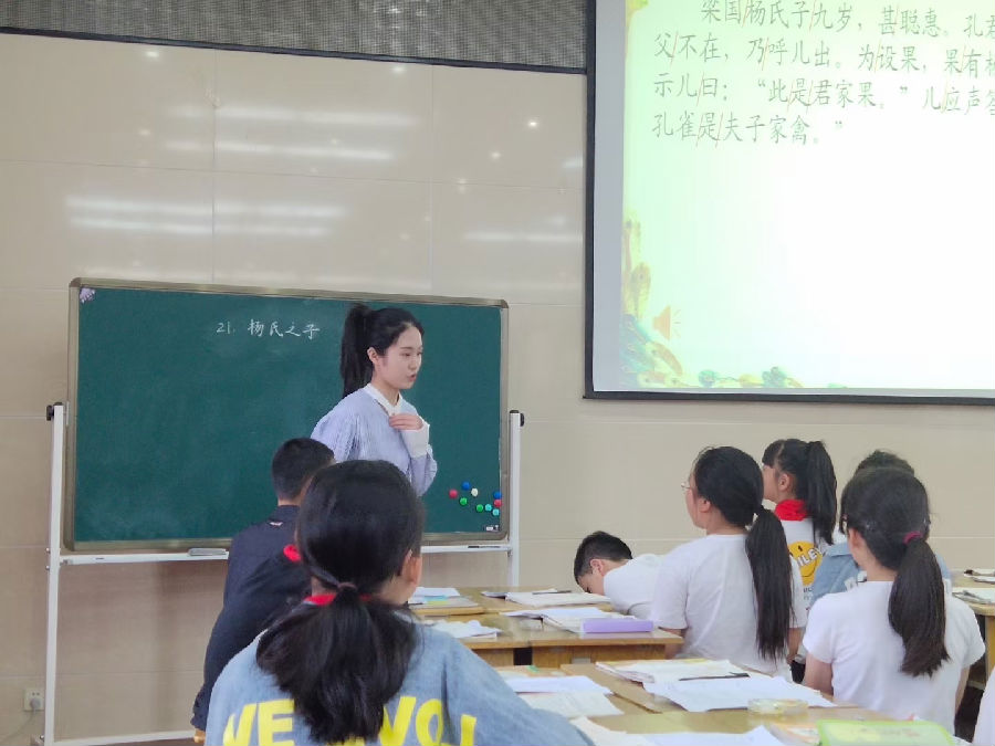 来自永嘉县枫林福和希望小学的谷紫佩老师执教五下《杨氏之子》,谷老师细致仔细,解读文本,拓展阅读。反复诵读,体会杨氏之子的“甚聪惠”,巧用“家X”类词语,解决停顿困难点“未闻孔雀是夫子家禽”。同学们听得认真,学得充实。对于杨氏之子的丰富人物形象的教学,谷老师运用联系生活实践,对比语言表达,表演朗读等方法,仿佛将这个杨氏之子请到了课堂中。