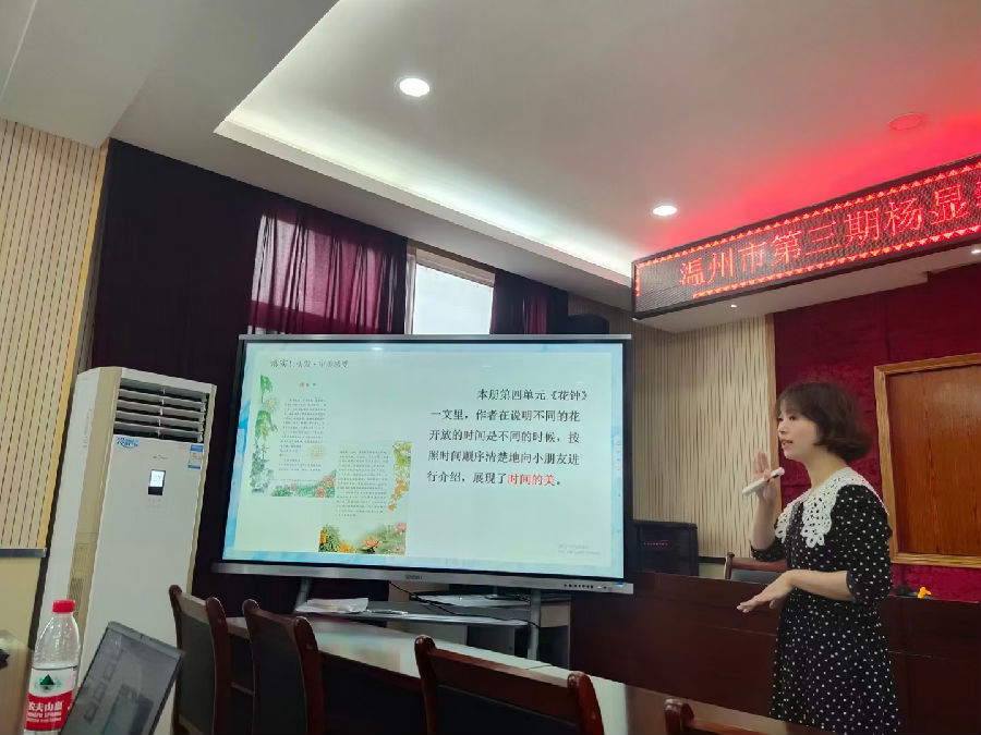来自永嘉县城西小学谢娇红老师,分享她对思维发展视角下的小学语文阅读教学的例谈。谢老师发现,新版课标将原来旧课标边缘提及的仅三四处的思维发展,隆重领到中心位。新解语文教材,以问题意识为例观教材整体推进,思维发展是整个小学阶段的事。以习作单元为例,察语文要素统整。以经典课文为例,看经典文章新编。以谢老师自己教授《麻雀》课例展开,写作秘密不乱不急不糊,感受活动巧设计。课外阅读引领,活动有趣支撑阅读,课外阅读是自发性的,有趣在前,带动在路上,思维发展才能落得扎实。