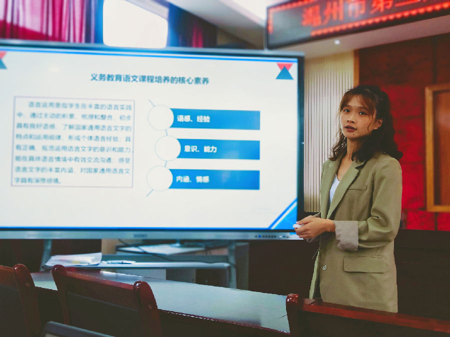 来自永嘉县上塘城北小学的盛秀燕老师,对比2011版本与2022版本语文课程标准,关注审美情趣与审美创造,重视对语言作品的审美。美育对于促进学生全面发展,培养高素质人才,有着重要意义。盛老师立足教材,提出统编教材中就是琳琅满目的美的世界。她借难为→可为→应为,以三年级下册美育内容的呈现,音韵美如《惠崇春江晚景》,空间美如《火烧云》,时间美如《花钟》,点拨我们应在美的认识中产生一种爱的情感。