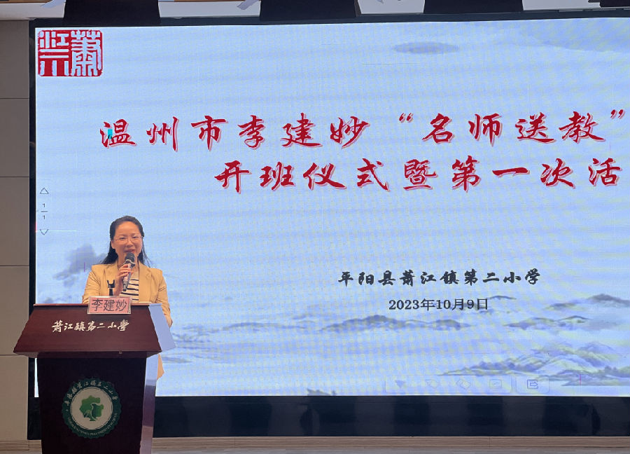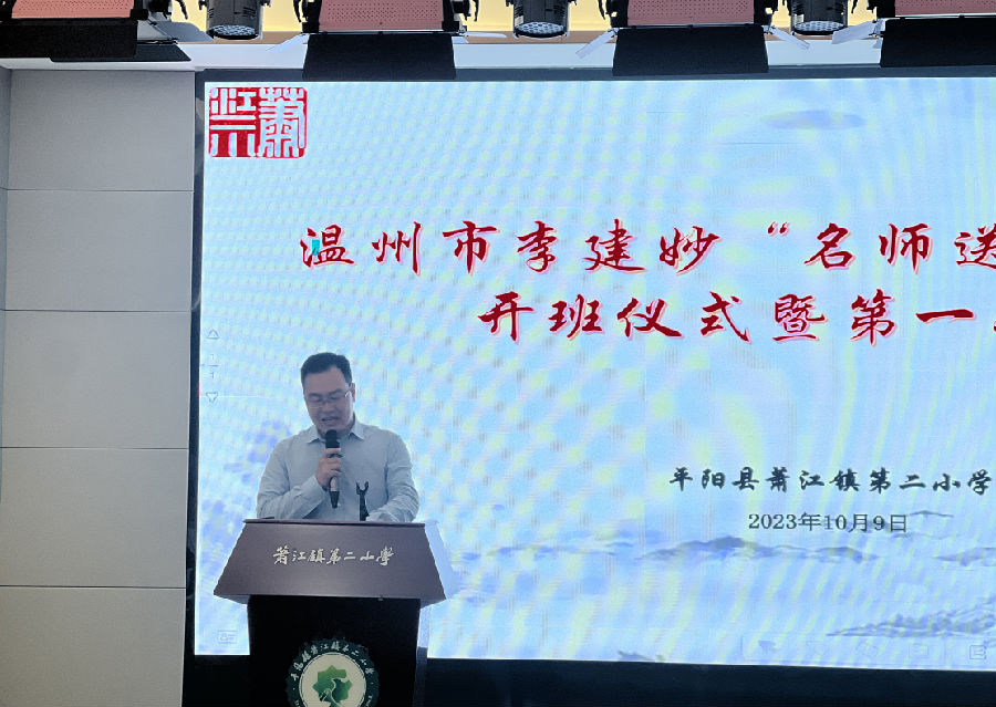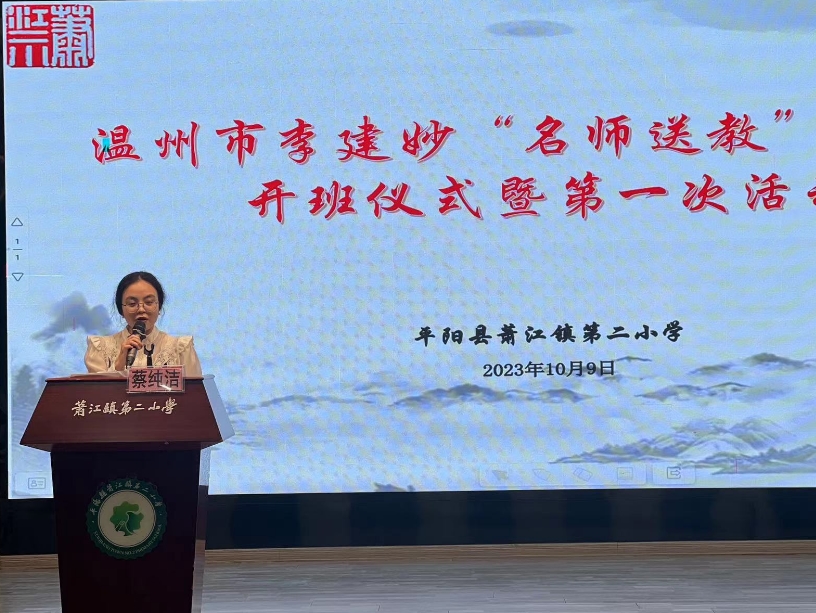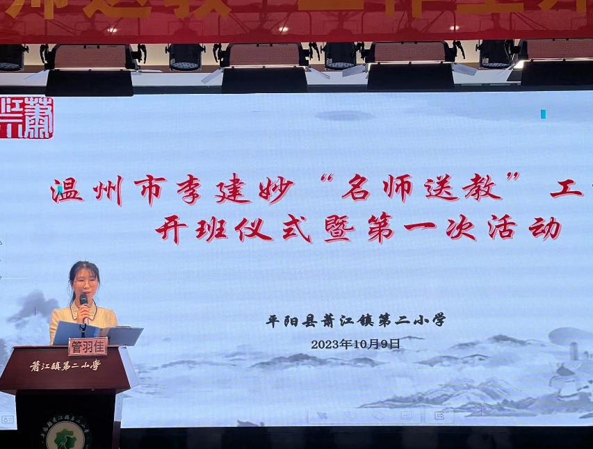 一个人可以走得很快,而一群人可以走得更远。2023年10月9日,温州市李建妙“名师送教”工作室开班仪式暨第一次研修活动在设站学校——平阳县萧江镇第二小学拉开帷幕。在温州市名教师李建妙老师的引领下,工作室的全体学员怀揣着热忱与期待参与了本次活动。本次活动由萧江二小黄喜梁老师主持。