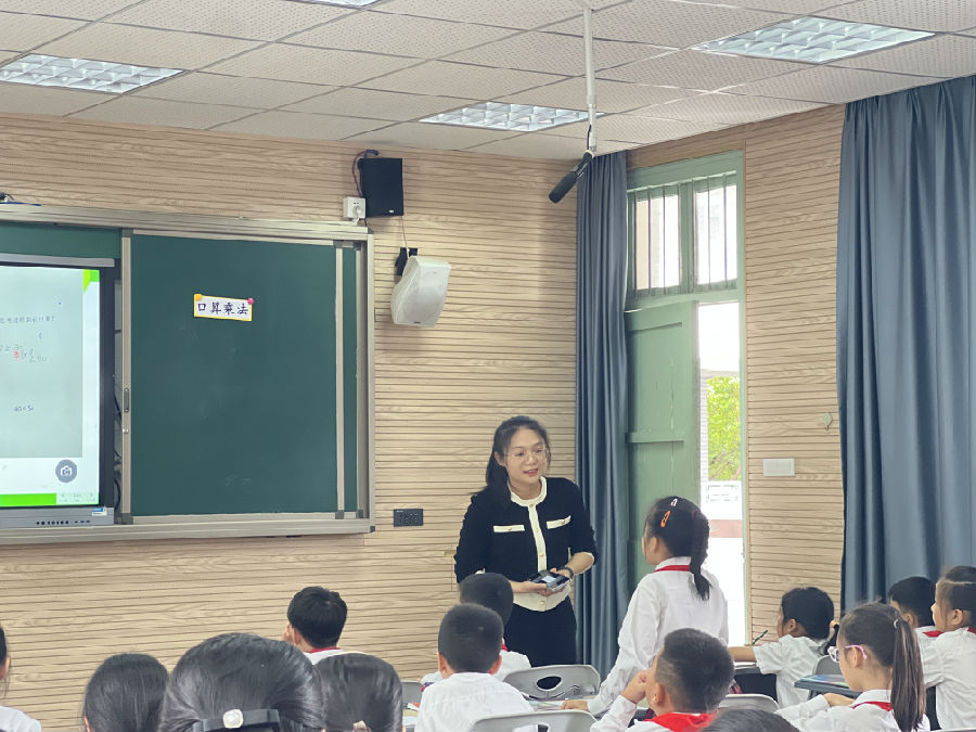 陈晓洋老师的《口算乘法》从熟悉的乘法口诀入手,围绕“乘法口诀为什么只编到9”这个核心问题,引发学生兴趣,借助具体的例子,让学生寻找2×3,20×3,200×3的共性,借助圆片和计数器发现他们只是计数单位不同,计算过程是一样的。进而厘清两位数乘法的算理和算法,为后续所有多位数乘法计算埋下伏笔。