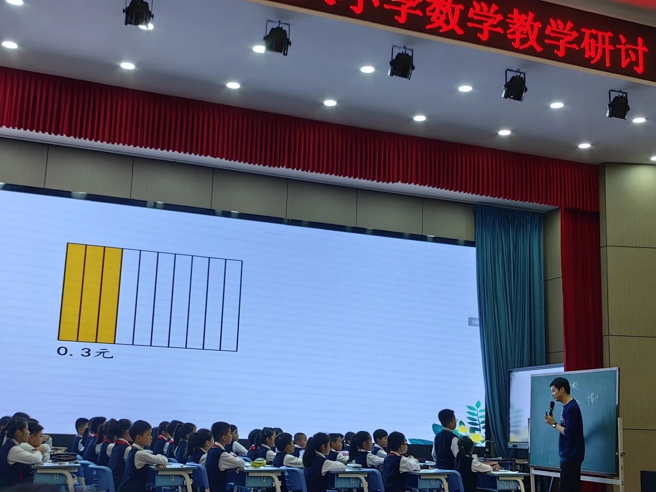 龙港市骨干教师杨威力老师执教三年级《认识小数》,杨老师积极组织教学,采用超市购物的方式引领学生轻松走进生活,走进小数,初步感受小数在现实生活中的应用,唤醒学生经验,激发了学生的学习兴趣。杨老师通过数形结合,化抽象变直观,从中构建了整数分数、小数的联系,体会小数的含义。