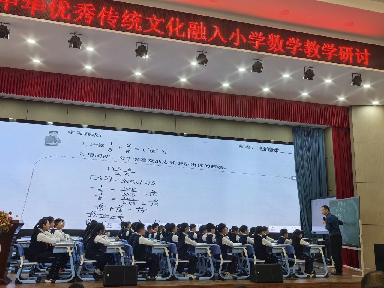 温州市名教师雷李桃老师执教《分数加减法》一课。雷老师通过九章算术上的一道古题引起了孩子们探究新知的兴趣。雷老师以学生为主体,让学生经历分析问题——提出问题——解决问题的过程,通过学生自主探究、合作交流,归纳出异分母分数的加减法计算方法,学生们充分体会到了整数、小数、分数运算的一致性。