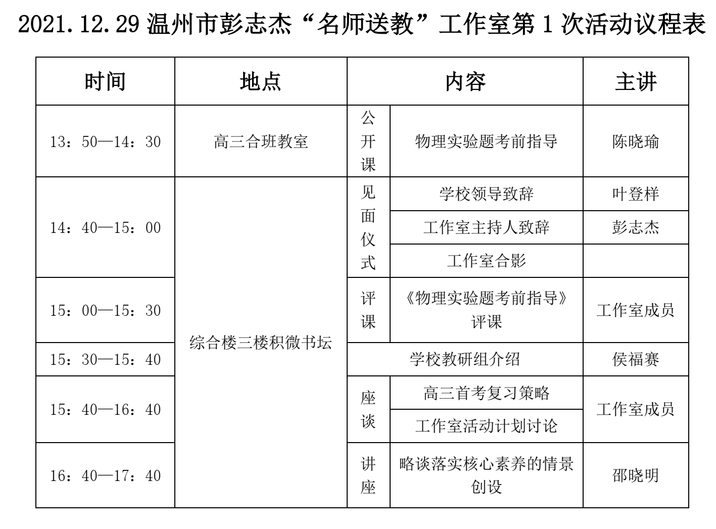 关于举行2021年温州市彭志杰“名师送教”工作室第1次活动的通知