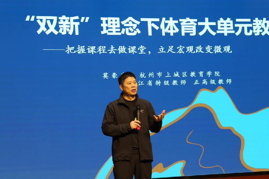 随后浙江省特级教师、正高级教师莫豪庆老师作为工作室的领衔人物,他的精彩讲座《“双新”理念下体育大单元教学设计》为老师们带来了新的启示和思考。主要讲了大单元的建构方法,主题的引领、教材的统整,素养目标的书写,内容结构化的螺旋式设计等,强调抓住核心概念是大单元教学结构化的关键点,并通过大单元教学实现教学内容结构化的持续性、整体性和实践性以及问题解决为导向的情境化学习,有效清理、归纳、整合,落实减负、增效、提质。同时,莫老师结合不同水平的篮球大单元设计案例来展开具体说明,让老师们更直接、清晰且深刻地学会体育大单元设计的基本方法。