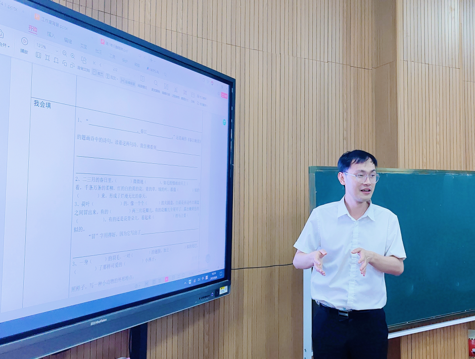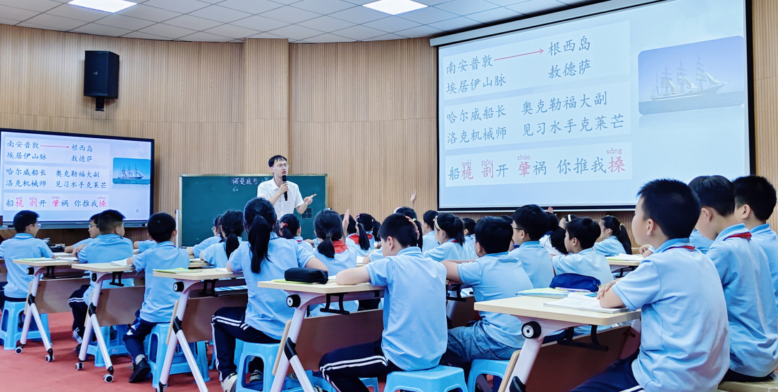 6月6日下午,活动在有序签到后开启。来自温州大学城附属学校的姚信服老师率先登场,带来四年级下册第七单元课例《“诺曼底号”遇难记》。课堂上,姚老师紧扣文本,引导学生透过语言文字,感受哈尔威船长的英雄形象与精神品质。细腻的文本解读、巧妙的问题设计,让学生沉浸于文学世界,也为听课教师呈现了一堂扎实且富有感染力的语文课。