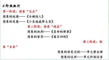 接着,陈涵、朱怡、潘钊妍、王方圆老师组成的教研小组分享了七上第六单元整体设计的思路说明。该小组从分析单元导语入手,指出本单元“想象”这一人文主题,通过整合小说、童话、神话、寓言等文体,构建“想象‘过去’‘现在’‘未来’”三阶教学体系。从《女娲造人》《小圣施威降大圣》的想象溯源与艺术逻辑,到《皇帝的新装》的想象批判,再到《寓言四则》的想象智慧,逐层推进。
