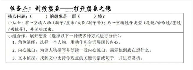 在整个单元的教学活动中,教师们聚焦单元整体思路,将“飞鸟”这一校园意象贯穿整个单元的情境任务,如绘制变化博弈图、创作“飞鸟的试炼”故事、撰写校园“新装”童话等,将想象训练与逻辑思维、现实关怀结合。同时,在单篇教学中突出方法指导,如《小圣施威降大圣》的“变化斗法”梳理与想象合理性探究,《皇帝的新装》的情节曲线绘制与“虚构与真实”辩证思考,让学生在读写实践中掌握想象的技法与深意。
