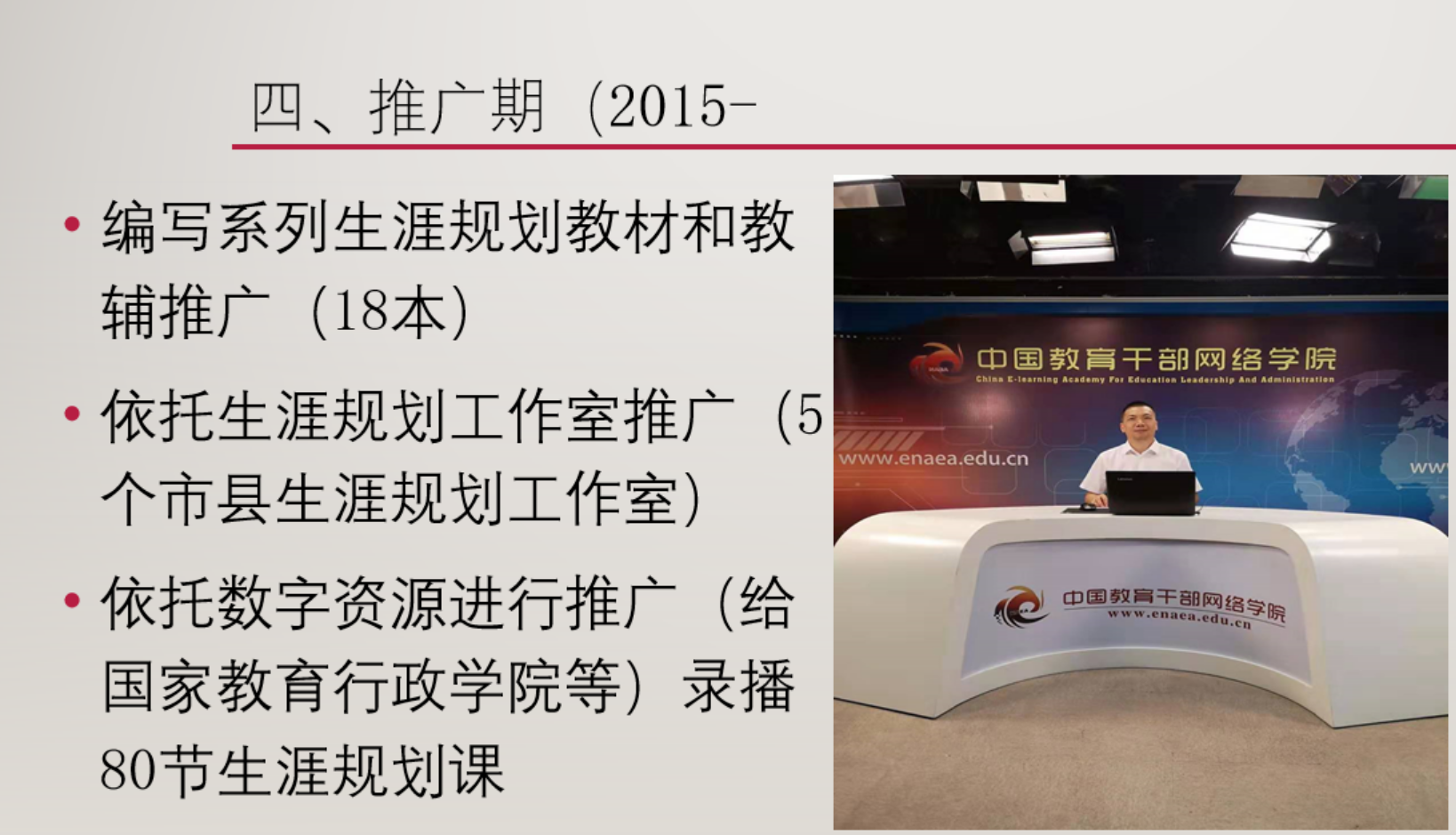 4.推广期(2015至今):注重成果转化与区域辐射。编写并推广系列生涯规划教材及教辅资源,依托工作室联盟与数字化平台,实现经验共享、模式输出,助力全国生涯教育生态建设。